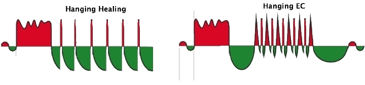 Allergies can be represented schematically by a combination of the above and the figure below: the moment the trace is present, there is a hangding healing (figure further down). If the trace is gone, then the Hamers Compass runs its course and the symptoms disappear, until the trace returns (figure above).